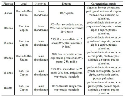 Todas as áreas de floresta secundária foram usadas como pasto e depois abandonadas, dando início à regeneração natural no local. O entorno das áreas localizadas na Fazenda Rio-Capim foi o mais conservado, pois é constituído principalmente de florestas secundárias antigas ou floresta primária. Já o entorno da Bacia do Uraim era bastante degradado, formado principalmente por pastagem e florestas secundárias jovens. A floresta secundária de 4 anos foi a que apresentou o entorno mais perturbado (100% pasto). A floresta intacta, ao contrário, possui seu entorno formado por floresta antiga sob exploração manejada (Tabela 5.2).