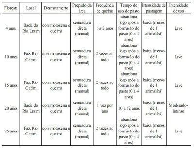 A Tabela 5.3 apresenta informações obtidas em entrevistas com a comunidade, baseadas na classificação de intensidade de uso de pastagens elaborada por Uhl, Buschbacher e Serrao (1988). Inclui informações sobre intensidade de degradação da área, obtidas por meio do tipo de preparo e manejo do pasto que havia no local anteriormente. Estes dados foram coletados também com o objetivo de estimar o nível de degradação das áreas de interesse.