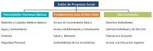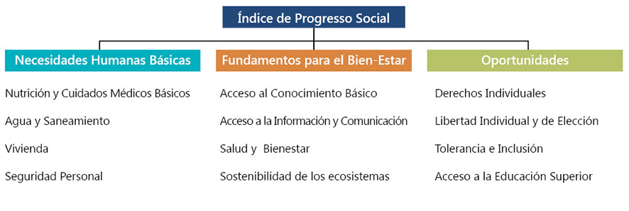 La SPI define el progreso social como la capacidad de la sociedad en satisfacer las necesidades humanas básicas, establecer las estructuras que garanticen la calidad de vida a los ciudadanos y dar oportunidades para que todos los individuos puedan alcanzar su máximo potencial (SPI, 2014). A partir de dicha definición, emanan tres cuestiones fundamentales para evaluar el progreso social de un determinado lugar, sea un país, estado o un municipio: