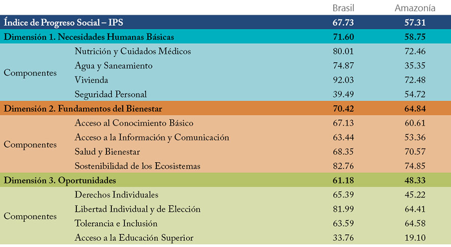 La Amazonía tiene un IPS (57.31) inferior al promedio nacional (67.73). De hecho, la región presenta resultados inferiores al promedio del Brasil para todas las dimensiones y casi todos los componentes del IPS. Aunque el informe ‘IPS Amazônia 2014’ use el promedio de los municipios brasileños para evaluar y comparar el desempeño de la región amazónica, es importante subrayar que el progreso social medido por el IPS del Brasil tampoco es favorable. Según el ranking presentado por la SPI (2014), el país se encuentra en la posición 46 en un grupo de 132 países, siendo que aquellos con la mejor clasificación (Nueva Zelandia, Suiza e Islandia) presentan IPS superior a 88. El mejor resultado de la Amazonía está en la Dimensión 2 (Fundamentos del Bienestar) con índice promedio de 64.84, mientras que la Dimensión 1 (Necesidades Humanas Básicas) presenta resultados intermedios (58.75) y la Dimensión 3 (Oportunidades) tiene el peor desempeño de la región, con un índice de apenas 48.33. Esa dimensión también presenta la mayor disparidad entre la región y el resto del país (21%), señalando al hecho de que faltan oportunidades para la población amazónica.