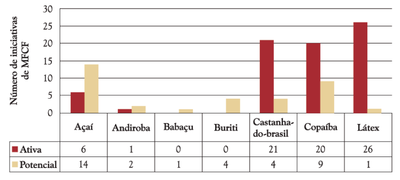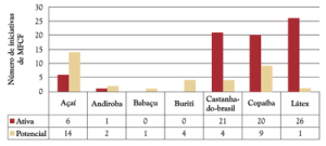 A análise desagregada do número de iniciativas de MFCF por espécie florestal e por status (comercialmente ativa ou com potencial) revela que há no estado iniciativas ativas de MFCF para quase todos os PFNM-alvo, exceto para a andiroba, com destaque para a castanha-do-brasil, a copaíba e o látex. Para todos os demais PFNM-alvo o número de iniciativas latentes (com potencial para manejo) foi maior do que o das iniciativas que efetivamente comercializavam os produtos florestais no período deste levantamento (Figura 22).