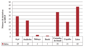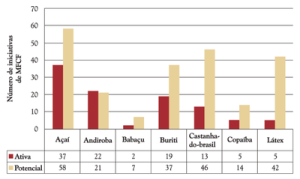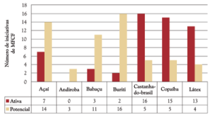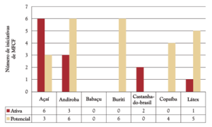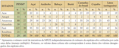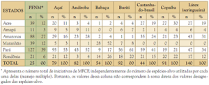 Iniciativas de MFCF de PFNM. Foram identificadas 325 iniciativas de MFCF que lidam com pelo menos uma das sete espécies florestais selecionadas de uso não madeireiro. Em geral, cada iniciativa identificada utiliza (ou utilizou nos últimos cinco anos) comercialmente várias espécies florestais nativas durante seus períodos de safra. Ou seja, quanto aos PFNM a regra geral na Amazônia brasileira é o uso/manejo de múltiplas espécies por cada comunidade ou unidade familiar (agro)extrativista.