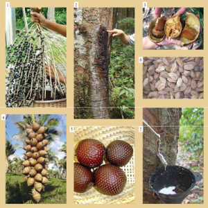 Figura 2. Produtos e/ou espécies florestais de uso não madeireiro que foram alvo do levantamento das iniciativas de MFCF na Amazônia Legal em 2009/2010. 1-Açaí (cacho); 2-Copaibeira (tronco perfurado para extração do óleo-resina); 3-Andiroba (fruto aberto exibindo as sementes); 4-Babaçu (cacho imaturo); 5-Buriti (frutos); 6-Castanha-do-brasil (amêndoas com casca); e 7-Seringueira (durante extração do látex). Fotos: Imazon.