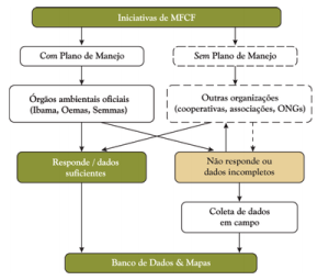 O fluxograma abaixo resume os procedimentos adotados no levantamento das iniciativas de MFCF com plano de manejo protocolado (em geral, madeireiro) e sem plano protocolado (em geral, não madeireiros) (Figura 3).