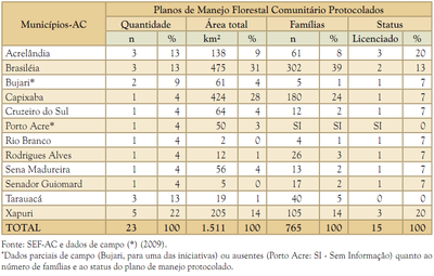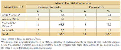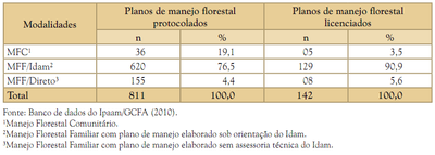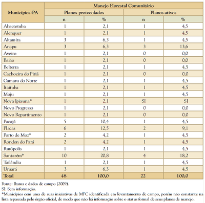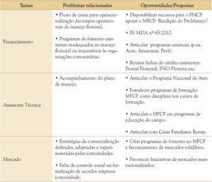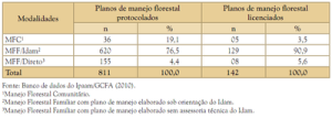 As iniciativas de manejo florestal praticadas por comunidades ou pequenos produtores individuais na Amazônia brasileira, em geral, enfrentam vários obstáculos para implementação de planos de manejo, tendo como consequência um grande número de planos protocolados (em especial, no caso do manejo madeireiro), porém inaptos ao licenciamento, e/ou comercialmente inativos, conforme observado neste estudo.