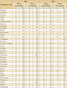 • com plano de manejo protocolado: iniciativas que tinham plano de manejo florestal protocolado no órgão ambiental, independentemente de sua fase de tramitação; em geral, esses dados foram fornecidos pelo órgão ambiental e eram referentes ao setor madeireiro.