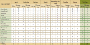 Tabela 18. Iniciativas de MFCF de PFNM identificadas no estado do Acre, por município e status da iniciativa, em 2009/2010.