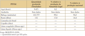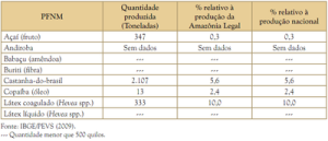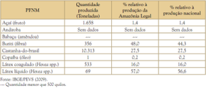 Tabela 21. Produção extrativa florestal do Amapá em 2009 referente aos PFNM-alvo do levantamento das iniciativas de MFCF 2009/2010.