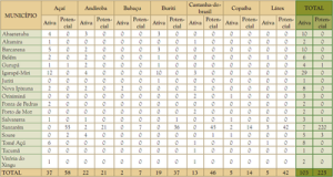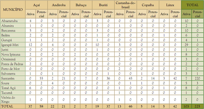 A análise desagregada do número de iniciativas de MFCF por espécie florestal e por status (comercialmente ativa ou com potencial) revela que há no estado iniciativas ativas de MFCF para todos os PFNM-alvo, com destaque para o açaí, a andiroba e o buriti. Por outro lado, para quase todos os PFNM-alvo, exceto a andiroba, o número de iniciativas latentes (com potencial para manejo) é maior do que o das iniciativas que efetivamente comercializavam os produtos florestais no período deste levantamento (Figura 20). Isso se deve exclusivamente ao contexto identificado no município de Santarém, onde há grande concentração de iniciativas com histórico de MFCF com uso de múltiplos PFNM, porém comercialmente inativos em 2009. Considerando-se apenas as iniciativas ativas, então o município de Igarapé-Miri é o que lidera em número de iniciativas de MFCF, com destaque para o açaí e o buriti (Tabela 26).
