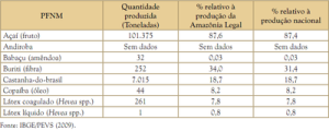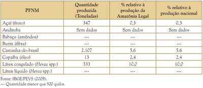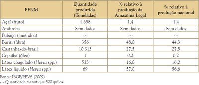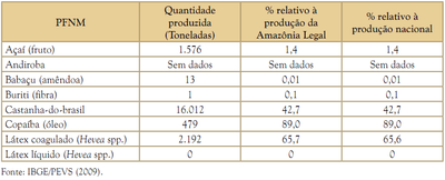 Segundo o IBGE/PEVS (2009), a produção extrativa florestal do Amapá é pouco expressiva, tanto no que se refere a produtos florestais madeireiros quanto aos não madeireiros alvo deste levantamento. O PFNM que mais se destaca é o látex líquido, respondendo por 42% da produção da Amazônia Legal e do Brasil, sendo o segundo maior produtor regional/nacional após o Acre. O açaí e a castanha-do-brasil representam, cada, apenas 1% do volume total produzido na região e no país. O babaçu, o buriti e a copaíba apresentam produção inferior a 500 quilos, e para a andiroba não há registro individualizado de dados (Tabela 21).