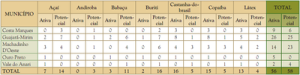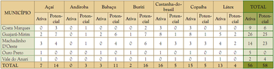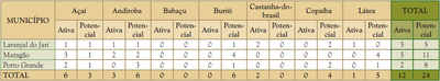 O município com iniciativas ativas para a maioria dos PFNM-Alvo é Laranjal do Jari (açaí, andiroba castanha e látex), seguido por Mazagão (açaí e andiroba) e Porto Grande (apenas açaí). Quanto às iniciativas com potencial para manejo florestal, em geral os três municípios possuem de um a quatro casos para os mesmos PFNM (Tabela 20).