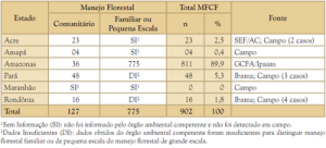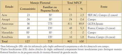Foram identificadas 902 iniciativas de MFCF que lidam com madeira, sendo 775 (86%) delas do tipo manejo florestal familiar ou de pequena escala (MFF) e apenas 127 (14%) de manejo florestal comunitário (MFC). Todas as iniciativas de MFF contabilizadas neste levantamento se situam no estado do Amazonas. Nos demais estados pesquisados não se obteve dados sobre essa categoria ou os dados obtidos não foram suficientes para filtrar as iniciativas de MFF dentre as iniciativas de manejo florestal de grande escala (Tabela 3).