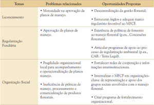 Os principais desafios à consolidação do MFCF recorrentemente identificados são: (i) a fragilidade de processos de licenciamento da atividade de manejo florestal em comunidades; (ii) a indefinição fundiária; (iii) a falta de assessoria técnica qualificada e adaptada à atividade; (iv) a dificuldade de acesso a crédito compatível; (v) a debilidade da organização social para as atividades florestais; e (vi) a limitação em acessar mercados (Amaral Neto et al., 2008). A superação desses obstáculos remete a um processo de fortalecimento das organizações comunitárias envolvidas na implementação de planos de manejo como estratégia de conservação e governança florestal.