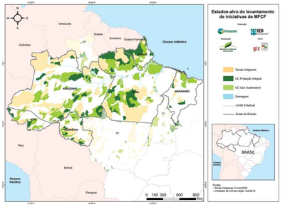 Desse modo, visando suprir tais lacunas de dados atualizados, o Instituto do Homem e Meio Ambiente da Amazônia (Imazon), em parceria com o Serviço Florestal Brasileiro (SFB), a Deutsche Gesellschaft für Internationale Zusammenarbeit (GIZ) e o Instituto Internacional de Educação do Brasil (IEB), realizou entre 2009 e 2010 um levantamento das iniciativas de MFCF que lidam com madeira e/ou com PFNM. A pesquisa foi conduzida nos estados do Amapá, Amazonas, Acre, Maranhão, Pará e Rondônia, por meio de visitas de campo, consultas a bancos de dados dos órgãos estaduais e federais de meio ambiente e entrevistas com atores-chave.