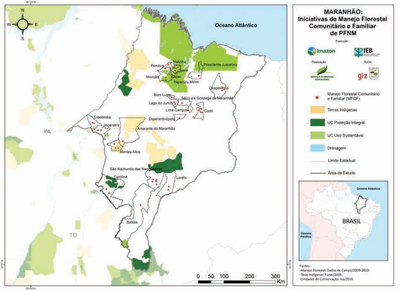 Objetivo, área de estudo e produtos florestais-alvo. O levantamento de iniciativas de Manejo Florestal Comunitário e Familiar (MFCF) realizado em 2009 e 2010 pelo Imazon e IEB, com apoio da GIZ e do SFB, teve o objetivo de identificar e localizar iniciativas de MFCF que trabalham com madeira e com produtos florestais não madeireiros (PFNM) – açaí, andiroba, babaçu, buriti, castanha-do-brasil, copaíba e látex de seringueira – em seis estados da Amazônia brasileira – Acre, Amapá, Amazonas, Maranhão, Pará e Rondônia. Este estudo ocorreu no contexto do Programa Federal de Manejo Florestal Comunitário e Familiar[1] (PMCF), instituído em 2009, no âmbito do MMA e MDA, e visa subsidiar as ações desse programa.