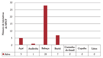 Todas as iniciativas de MFCF de PFNM identificadas no Maranhão estavam comercialmente ativas. O babaçu foi destacadamente a espécie florestal utilizada pela maioria das iniciativas, seguido pelo buriti e açaí. Apenas uma iniciativa relatou o uso comercial do óleo de andiroba e nenhum caso foi identificado quanto à castanha-do-brasil, copaíba e látex (Figura 18).