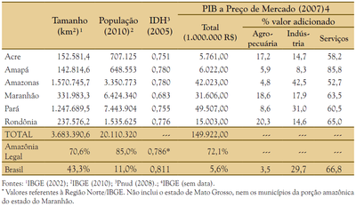 Em conjunto, esses seis estados amazônicos compreendem aproximadamente 70% da área da Amazônia Legal, 85% de sua população e em 2007 geraram 72% do Produto Inter-no Bruto (PIB) dessa região. O Índice de Desenvolvimento Humano (IDH) desses estados varia entre 0,683 (Maranhão) e 0,780 (Amapá e Amazonas), não diferindo muito dos valores encontrados para a Região Norte (0,786) e para o Brasil (0,811).
