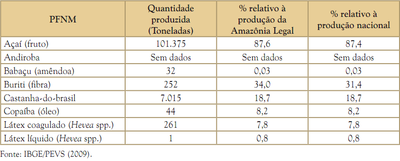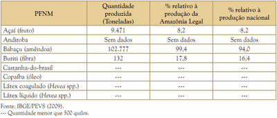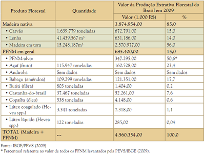 Segundo o IBGE/PEVS (2009), a produção extrativa vegetal do Brasil atingiu R$ 4,6 bilhões em 2009, dos quais 85% foram gerados pelo setor madeireiro e apenas 15% por produtos florestais não madeireiros (equiva-lente a R$ 685,4 milhões). Em conjunto, as sete espécies-alvo de uso não madeireiro responderam por 50,6% do total gerado por esse segmento produtivo florestal, com destacada participação do açaí (23,4%) e do babaçu (17,7%) (Tabela 2).