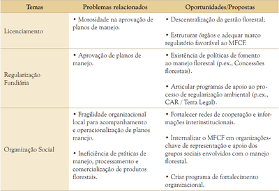 Como propostas para superar a morosidade no processo de autorizações para operacionalização de planos de manejo, identificou-se a necessidade de constituir estruturas específicas nos órgãos governamentais para centralizar demandas para o manejo florestal comunitário. Além disso, é necessário criar marcos regulatórios mais adequados às realidades dos planos de manejo, considerando exigências atuais de levantamento do potencial florestal (incorporando não madeireiros).