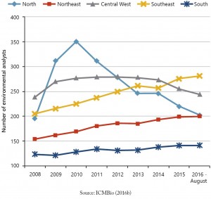 Figure 1. Number of ICMBio environmental analysts stationed by region of Brazil between 2008 and August 2016