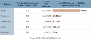 Figure 2. Ratio between Conservation Unit area and the number of ICMBio environmental analysts by region of Brazil