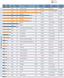 Critical UCs, especially the top 10 in the ranking, are those most accessible and vulnerable to threats arising from expansion of the agricultural frontier and infrastructure projects. The vulnerability of these areas stems from failures related to four factors necessary for the success of any enterprise: strategy, personnel, financial resources, and implementation.