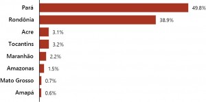 Figure 4. Percentage distribution of deforestation by state in the 50 critical Conservation Units of Legal Amazon between 2012 and 2015