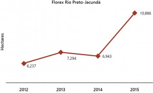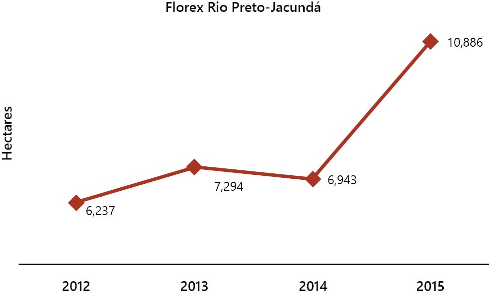 Florex Rio Preto-Jacundá presented an increasing trend of deforestation between 2012 and 2015 (Figures 11 and 12). In 2015, its deforested area was 57% higher than in the previous year, reaching approximately 11,000 hectares. The main pressures and threats to the UC are associated with lland disputes and cattle ranching. Florex is very vulnerable to pressures and threats because it is not recognized by the environmental agency, and it is not being managed. This is because six years after its creation, the government of Rondônia, through a decree, created a Resex of the same name overlapping 95.3 thousand hectares (9% of its area) of Florex. The government claimed that Decree No. 7.336/1996 which created Resex revoked the Decree No. 4.245/1989 which had created the Florex. The Secretariat for Environmental Development (Sedam) of Rondônia keeps this understanding and emphasizes that the State System of Conservation Units[12] (Seuc) does not recognize Florex as a UC category. However, the State Prosecution Service of Rondônia (MPE-RO) understands that Florex could only have been repealed by a specific law, approved by the Legislative Power for this purpose, according to a constitutional requirement (Article 225, paragraph 1, III)[13]. In this case, the decree that created the Resex is an act of the Executive Branch and does not mention Florex. Therefore, from a legal point of view, there was no implicit reduction, since such a change would be unconstitutional. Approximately 35% of the Florex area is overlapped with three UCs: Flona Jacundá (19.55%), Esec Samuel (5.72%) and Resex Rio Preto-Jacundá (9.57%) (ISA, 2016). Discounting these overlaps, the “forgotten” area of Florex is 686 thousand hectares, and it is in this area that deforestation is increasing. There is still no legal action from MPE-RO demanding the actual management of Florex. ________________________________ [12] Decree Law no. 1.144/2002 created the State System of Nature Conservation Units of Rondônia (Seuc/RO). [13] A response was sent by the Operational Support Center for Environmental issues of the State Prosecution Service of Rondônia, by email dated May 18, 2015.