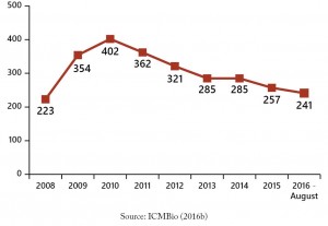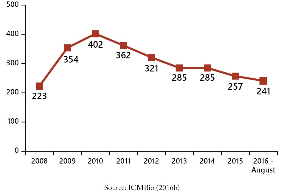 Figure 33. Number of environmental analysts from ICMBio stationed in the Legal Amazon between 2008 and August 2016