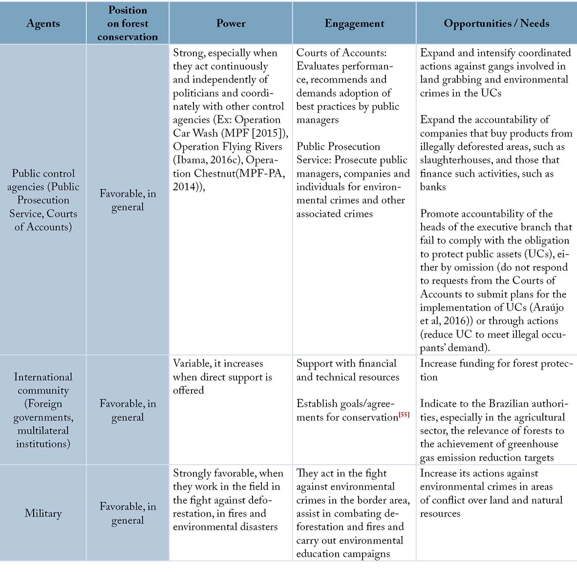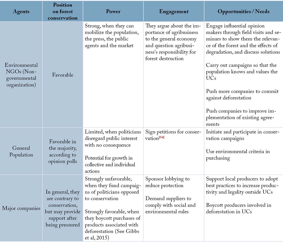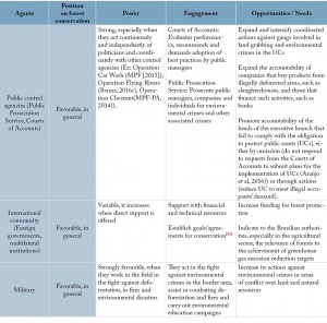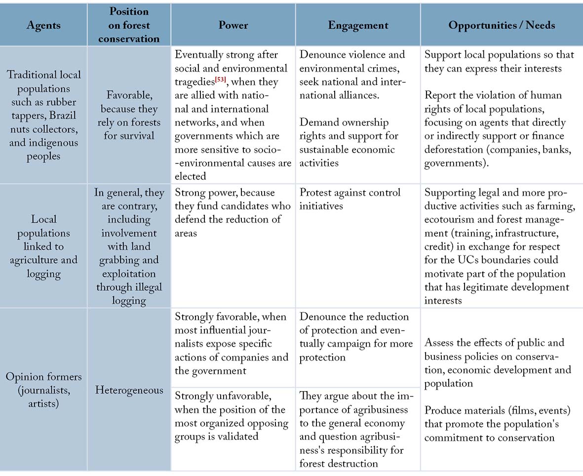 The Amazon deforestation has increased due to actions and omissions of the public authorities and private companies. Thus, to eliminate deforestation and ensure effective protection of UCs in the long term, it will be necessary to build a consistent strategy, provide human and financial resources, and improve effectiveness. However, it is unlikely that the leadership to carry out these tasks comes solely from the government, since part of it clearly acts against the public interest, which results in weak indicators, not only in the environmental area (Table 1). International experience shows that conservation in the long run, whether through protected areas or other measures, resulted from the vigorous and continuous involvement of popular movements, conservationists, politicians, artists, entrepreneurs, journalists, religious figures, liberal professionals, and others. Engagement involved diverse motives, such as reducing environmental impacts, protecting strategic resources for socioeconomic development, and maintaining the source of associated emotional experiences, for example, scenic beauty and belonging to a place (patriotism, nationalism). There is potential for stronger involvement in conservation in Brazil. Opinion polls show that 91% of Brazilians are favorable to forest conservation (MMA, 2012) and that another 91% are proud of the country, motivated to a large extent, by its natural beauty (Agência Estado, 2007). The example of the Greenpeace campaign that secured 1.4 million signatures to support a zero deforestation bill (Greenpeace, 2016) demonstrates the potential of mobilization. Next, we explore examples of opportunities to intensify the engagement of various agents in favor of UCs and the reduction of deforestation in general. Table 1 summarizes the opportunities.