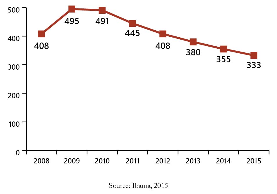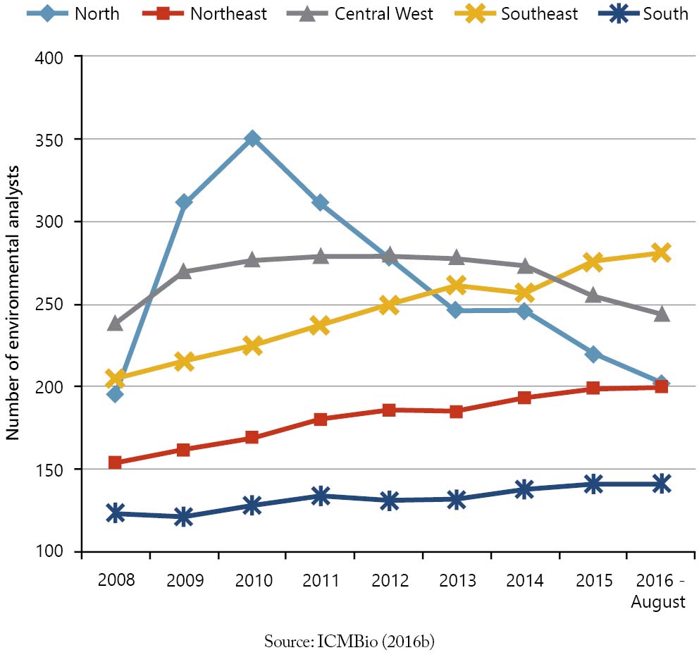 The Northern region has also been losing environmental analysts at Ibama, who assist in field surveillance actions in the UCs. The comparison between the Brazilian regions shows that the only regions that suffered a reduction in the number of environmental analysts between 2009 and 2015 were the North and the Northeast, with 32% and 19%, respectively (Figure 3).