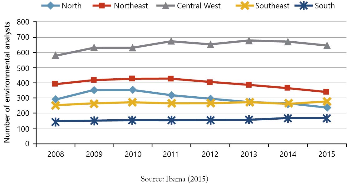 Figure 3. Number of Ibama environmental analysts stationed by region of Brazil between 2008 and 2015