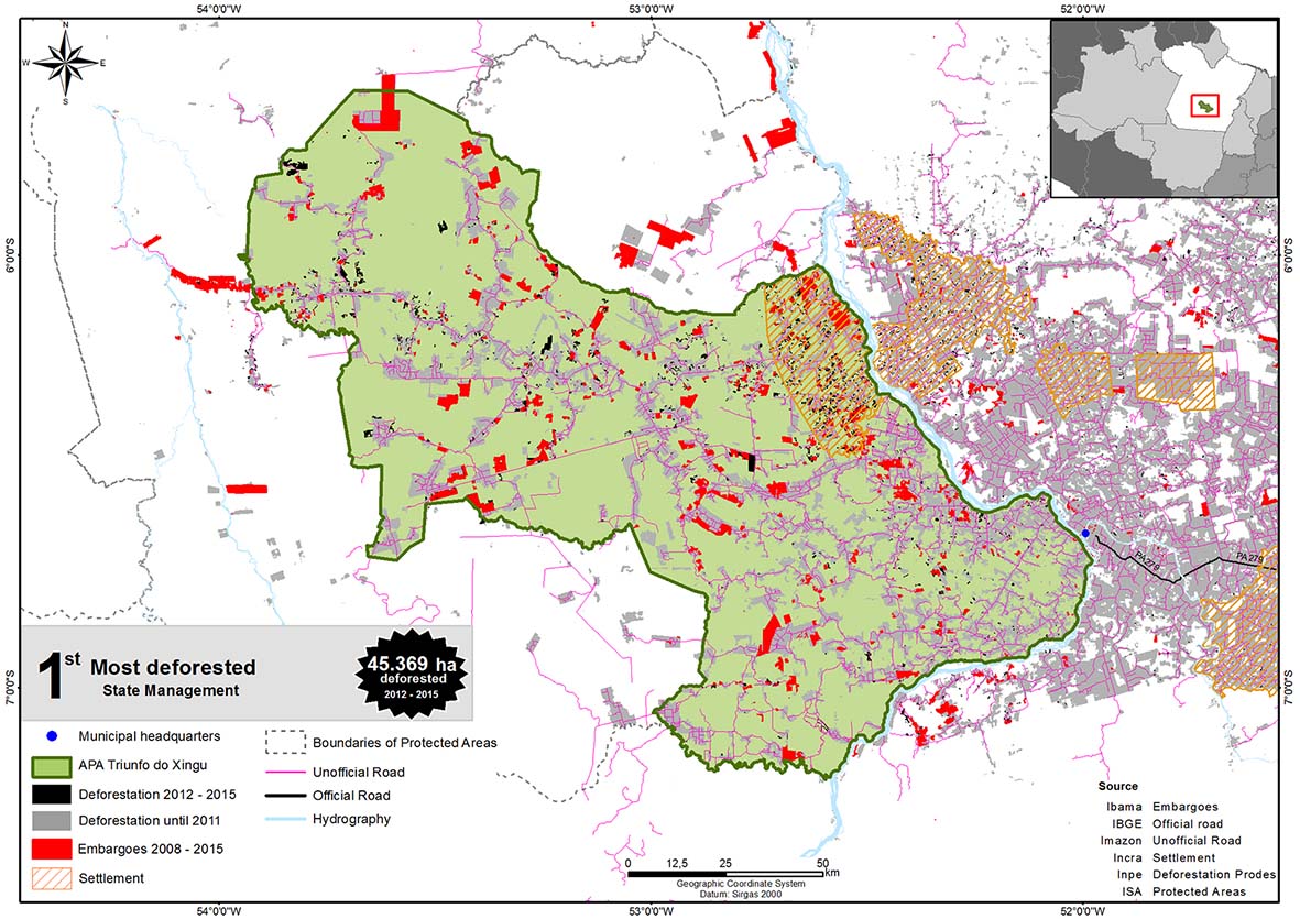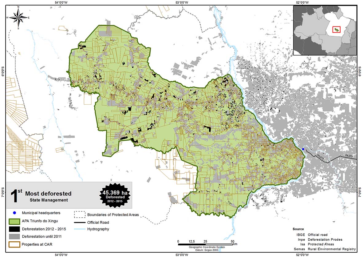 The first 10 positions in the ranking concentrated 79% of the deforested total within Legal Amazon Conservation Units between 2012 and 2015 and 82% of the total deforestation in the ranking of the 50 UCs (Figure 7). Eight of them showed a trend of increase in the annual rate of deforestation and two presented a trend of reduction, as shown in the graphs in the subsections dedicated to each UC. It is interesting to note that these UCs remained in the top ten positions in relation to the previous ranking (2012-2014), with five rising, two falling, and three maintaining their positions. All 10 UCs are for sustainable use and are distributed in three protection categories, considering that Florex and Resex have the same purpose: five APAs, which aim to discipline the process of non-traditional occupation and ensure the sustainability of the use of natural resources; three Florex / Resex, which aim to protect the territory used by traditional extractive populations, who manage the timber and non-timber forest resources; and two Flonas, aimed at the sustainable management of native forests. Low governance to achieve the objectives of creating these UCs explains their high rates of deforestation. Next, we present maps and graphs of deforestation between 2012 and 2015 for each of the 10 most critical UCs, in descending order on the ranking, and we analyze the causes of deforestation, the pressures and the risks to which they are subject to in order to reduce their protection in size or degree. We also present maps of the Rural Environmental Registry (CAR) for the UCs of the state of Pará, according to data available in February 2016.