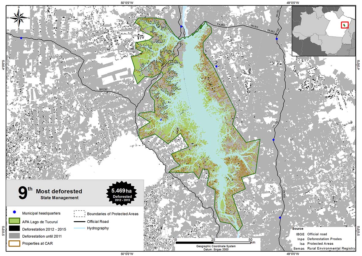 About 60% of the APA Lago de Tucuruí area has already been deforested (ISA, 2015b) and deforestation showed an increase tendency between 2012 and 2015 (Figures 28 and 29). Between 2014 and 2015 deforestation rates increased by 273% in the APA, reaching almost 3 thousand hectares (Figure 29). The UC is formed by the banks of the lake of Tucuruí HPP, built in 1984, and by the more than 1,600 islands that emerged from the flooding of the lake area (Figure 28). The main pressures and threats to the UC are predatory fishing, illegal logging and deforestation for crop and pasture formation (Ideflor-bio, 2015b). Cattle ranching has led to deforestation on the margin areas of the lake, and, depending on the size, on the islands as well (Jatoba, 2006). According to the management team[40], the land issue of the area is uncontrolled and there is still no forecast for completion of the land survey. The APA manager estimates that approximately 30 thousand families live in the UC (Ideflor-Bio, 2015b), and further, there are many properties registered in CAR (Figure 30). During an extraordinary meeting of the APA managing council in April 2015, the UC manager attributed the high deforestation to the limitations of management: i) the absence of a management plan; ii) insufficient staff, taking into account quantitative and technical ability; and iii) deficiency of equipment to perform surveillance, monitoring and environmental education actions (Ideflor-bio, 2015b). It is surprising that APA Lago de Tucuruí faces such management problems, since it received environmental compensation resources. In July 2015, it had approximately R$ 13 million in financial resources derived from environmental compensation for the construction of the HPP and its navigation lock-system (Ideflor-bio, 2015c). The management team argues that they face difficulties in utilizing these resources, since, once deposited in a state account, they are considered public and must follow the rules of public procurement law. However, they informed that their priority is the preparation of the management plan by the end of 2017. They also affirmed that, at the end of 2015, trucks, motorboats and other equipment were purchased to assist in the surveillance actions.[41] ________________________________ [40] Information obtained by means of a telephone conversation with the team manager of APA Lago de Tucuruí on August 12, 2016. [41] Idem note 40.