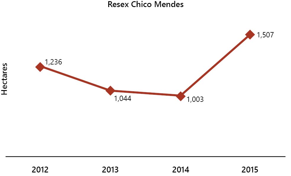 Resex Chico Mendes was one of the first federal extractive reserves to be created and is the largest in Brazil (Figure 31). There was a tendency for the reduction of deforestation in the UC, between 2012 and 2014, but in 2015, deforestation grew 50% compared to the previous year (Figure 32). The proximity of road BR-317 favors illegal occupation, illegal logging and cattle ranching within this UC. Resex is home to about 10,000 people, but the residents’ association estimates that 10% of this population are illegal occupants (Globo Rural, 2015). It is possible that the increase in deforestation in the UC in 2015 is a result of activities carried out in irregularly occupied areas. The UC management team[42] consists of only three people, and the management plan is out of date, with no provision for updating. The managing council is active, however, there were no meetings in 2016. Surveillance actions occur periodically, when there are complaints and in some large operations; however, the lack of personnel and financial resources makes it difficult to carry out these and other actions within the UC. There are almost 90 cases for the judgment of infractions in the reserve, ten of them aim at the removal of illegal occupants. ________________________________ [42] Information obtained through a telephone conversation with the UC manager, on August 12, 2016.