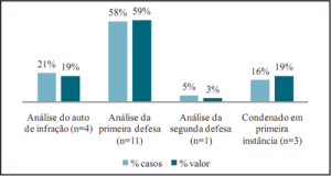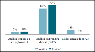 A maioria desses grandes casos no Ibama (58%) estava aguardando análise de defesa em 1ª instância fazia em média 493 dias e correspondiam a 59% do valor de multas nessa amostra específica (Figura 2). Outros 21% ainda aguardavam a homologação do auto de infração e concentravam 19% do valor das multas. Dos 19 casos, apenas 16% já haviam sido condenados em 1ª instância, ou seja, a defesa havia sido indeferida ou o auto de infração havia sido homologado (Figura 2).