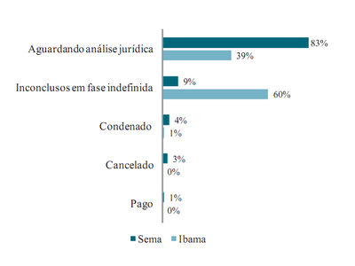 Grande parte dos casos concentrava-se nos departamentos jurídicos dos órgãos ambientais. Por exemplo, 39% dos casos no Ibama estavam possivelmente aguardando análise de defesa (Figura 1). Na Sema, 83% dos processos estavam aguardando análise do departamento jurídico (Figura 1). No entanto, devido à limitação de informações dos sistemas via internet, não foi possível determinar quais casos aguardavam análise de defesa e quais aguardavam outro tipo de análise jurídica[6]. Em 60% dos casos no Ibama e 9% na Sema foi possível constatar que eles não haviam sido encerrados e as multas não haviam sido quitadas ou canceladas. No entanto, as informações contidas nos sistemas da internet não eram suficientes para determinar a fase exata dos processos e, por isso, esses casos foram classificados como inconclusos em fase indefinida (Figura 1).