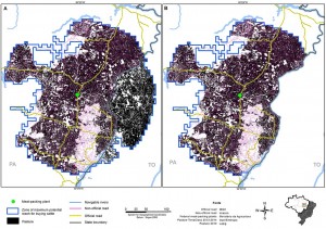 In order to project the potential maximum zone ranges for purchasing cattle of each meat-packing plant we used the function of a program (Cost Distance from ArcGis) that makes it possible to identify all and use all of the routes available near the plants until reaching the maximum purchasing distance obtained. To do that, we used the location of the meat-packing plants and considered the following routes: official roads (IBGE, 2012) and non-official roads[7] (Imazon, 2012), navigable rivers (Inpe/Prodes, 2015) and pastures in 2014 in the Amazon biome (Inpe/Embrapa, 2016) and in 2010 for the portion of the Cerrado biome contained in the Brazilian Amazon (Lapig, 2010). See an example of a potential purchasing zone for a packing plant in Figure 4A. To confirm if the reaches of the potential cattle-purchasing zones generated by ArcGis were plausible, we consulted the literature, key informants (a total of six, including rural producers and veterinarians from the agriculture and ranching defense agencies) and the database of the Ministry of Agriculture, Ranching and Supply (Mapa), who the destinations of animals for from each state. When the information generated by ArcGis and the information supplied by the aforementioned sources did not coincide, we had to exclude or add areas to the zones defined by ArcGis. That adjustment resulted in a 7% cut in the zone initially calculated. The principal adjustments were made in Amazonas, Pará and Amapá. That occurred, for example, when ArcGis recorded the potential purchasing zone of a packing plant or part of it in an area of a neighboring state where the company does not by cattle, according to the bibliography, key informants and/or the database from Mapa consulted. For example, our data sources informed us that it is common for animals to leave Pará and be taken to Tocantins for slaughter, but not the opposite. In those cases, then, we excluded the territory of the neighboring state from the zone (See an illustration of that example in Figure 4B). Another example was when the zone for purchasing cattle of a given meat-packing plant extended to municipalities that were in fact not suppliers, and we had to expand the zone according to information provided by our data sources.