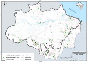 Figure 6. Location of the 157 active and inactive meat-packing plants registered with the SIE and SIF in the Brazilian Amazon in April 2016. The numbers beside the location points of the meat-packing plants correspond to the identification number in Appendix 3