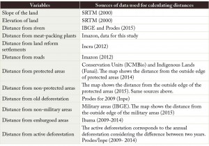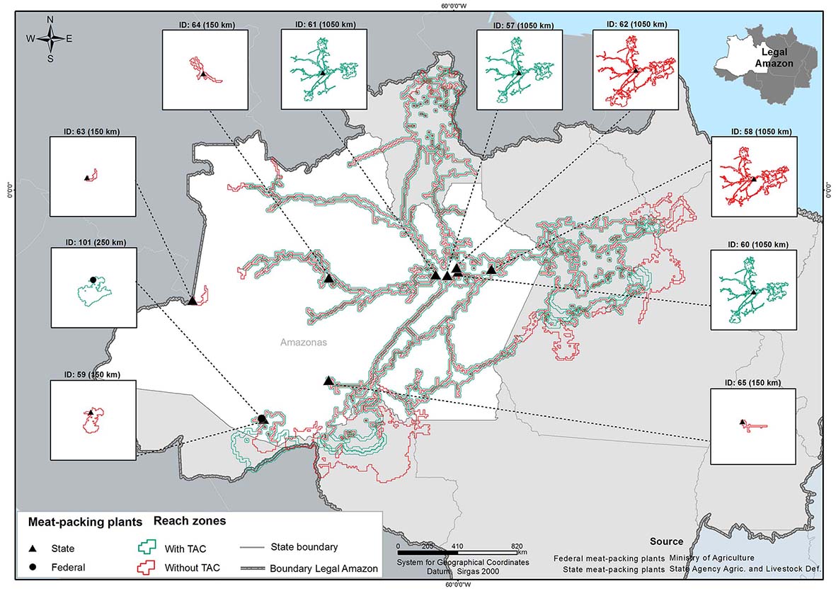 Figure 9. Examples of characteristics that influence the potential buying zones of the meat-packing plants mapped in the Brazilian Amazon in 2016