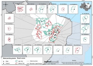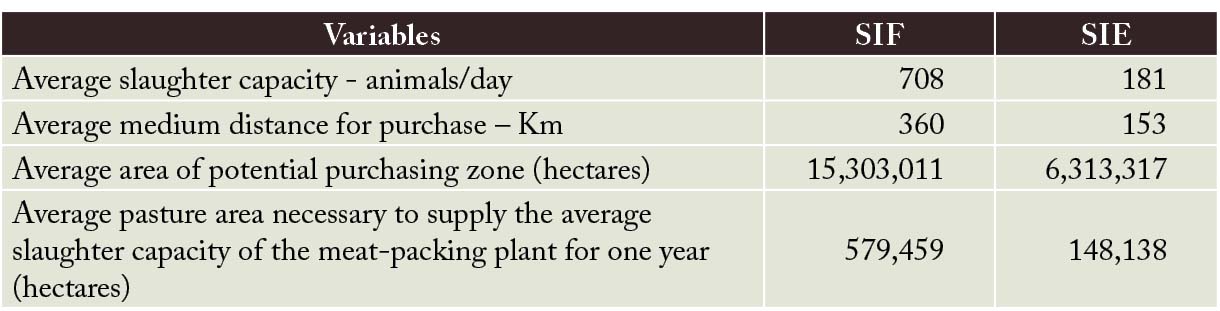 Our analysis was able to deal with most of the meat-processing industry, because we mapped the meat-packing plants responsible for 93% of slaughter in 2016, according to IBGE (2017a). These are the meat-packing plants registered with the State Inspection Systems (SIE), which can sell only in the states where they are located, and in the Federal Inspection System (SIF), who may sell throughout the country and even export, if they meet additional criteria. We did not map the meat-packing plants and slaughterhouses registered with these Municipal Inspection Systems (SIM), which can sell only in the municipalities where they are registered. Although in larger number, the companies registered with SIM account for only 7% of slaughter activity according to IBGE (2017a) and their data are harder to found, since they are not systematically made publicly available. There are also clandestine slaughterhouses that are not registered with any sanitary inspection system, which accounted for less than 10% of slaughters in 2012 according to Cepea (Cepea, 2014). As we will show later, the purchasing zones analyzed covered almost all of the pasture areas. Thus, the limitations in municipal data did not result in a significant loss for the analysis.