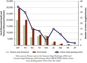 Figure 7. Number of active meat-packing plants, cattle herd and pasture area by state in the Brazilian Amazon in 2016