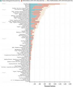 Figure 24. Ranking of the companies in terms of exposure to three risks associated with deforestation in their potential buying zones in the Brazilian Amazon in 2016. The ranking includes the companies exposed to at least 50 thousand hectares of the three risks totaled together[16]