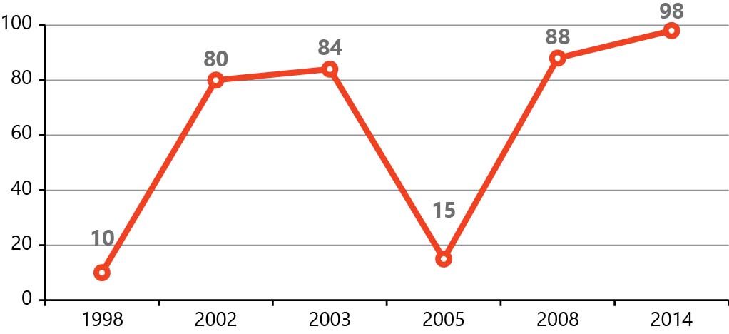 The lack of control of foot-and-mouth disease kept most Brazilian states from exporting fresh beef up to 1998 (Naranjo and Cosivi, 2013). To open up the market, state, municipal and federal governments and the private sector (ranchers, associations, federations and the confederation) organized to control the disease by vaccinating the entire herd. Given the complexity of the problem, the National Program for Eradicating and Preventing Foot-and-Mouth Disease (Pnefa) established goals and deadlines, according to the Terrestrial Animal Health Code, established by the World Organisation for Animal Health (OIE), and zones for moving forward with control (Lima et al., 2005; Aeapa, 2006)[1]. The commitment was so clear that it even established that the private sector should mobilize “financial resources and political influences to maintain the program” (CRPBZ, 2016). In 1998, the first zone free of foot-and-mouth disease in Brazil was recognized, made up of two states that together accounted for about 10% of the herd (Figure 1). The control advanced rapidly, but cases of the disease were recorded in 2001 and 2005, which reduced the percentage of the clean herd (Figure 1). Those cases threatened the economy and closed markets. The work continued, and 2016 was the tenth straight year without recorded foot-and-mouth disease in Brazil. As a result of the collective effort, from 1998 to 2014 control grew from 10% to 98% of the herd (Figure 1) and enabled Brazil to increase exports from 5.7% to 21.7 % of production with an additional revenue of U$ 5.5 billion (Pnefa, 2014; IFNP, 2000 to 2015). In 2017, Roraima was declared free of foot-and-mouth disease throught vaccination by the Ministry of Agriculture, Ranching and Supply (Mapa). That recognition allows the sale of animals from all states in Brazil, except Santa Catarina, the only state classified as free of foot-and-mouth disease without vaccination. The next step is to seek international recognition (OIE) so that the state can also export live animals to other countries (Portal Brasil, 2017). With the update in the status of Roraima in 2017, only two states (Amapá and Amazonas) are still in the zone classified as infected, besides a small zone in the state of Pará (Figure 2) that borders those states and is classified as a buffer or protection zone (Pnefa, 2017).