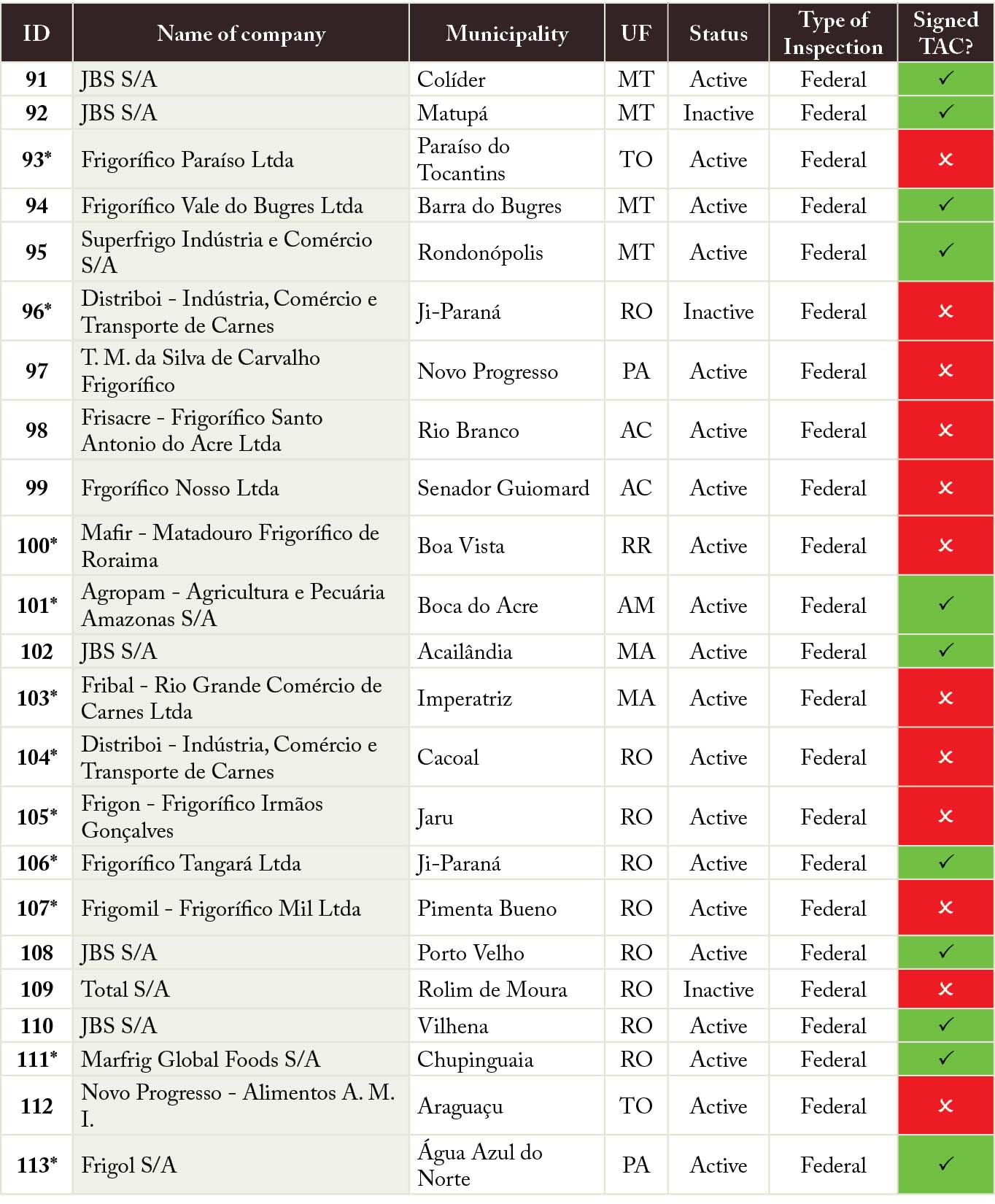 Interviews with representatives of the companies owning the meat-packing plants revealed that the 157 plants mapped in the Brazilian Amazon belonged to 110 companies, but only 128 plants, belonging to 99 companies, were active in 2016.