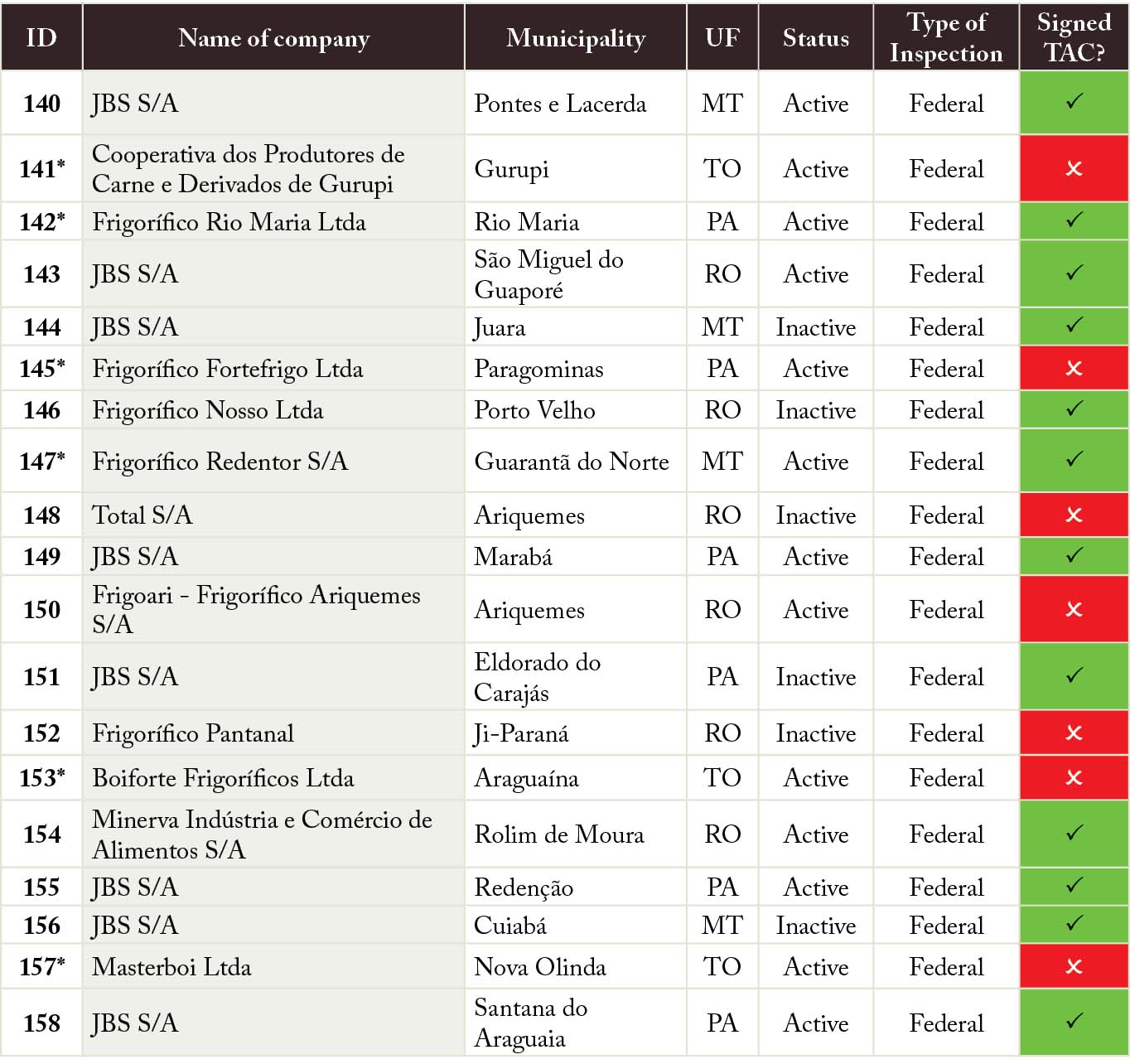 __________________________________ [9] The ten companies are JBS, Marfrig Global Foods, Minerva Alimentos, Mercúrio Alimentos, Masterboi, Vale Grande, Frigol, Frigon, Fribal and Cooperativa dos Produtores de Carne and Derivados de Gurupi.