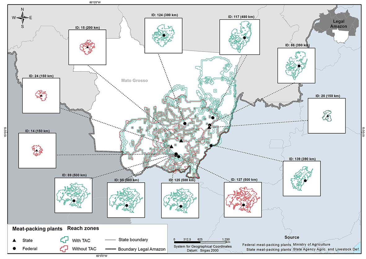 Figure 10. Potential cattle-buying zones for 12 active and inactive meat-packing plants registered with the SIE and SIF and with and without TAC located in southeastern Mato Grosso in 2016. The ID corresponds to the meat-packing plant number in Appendix 3