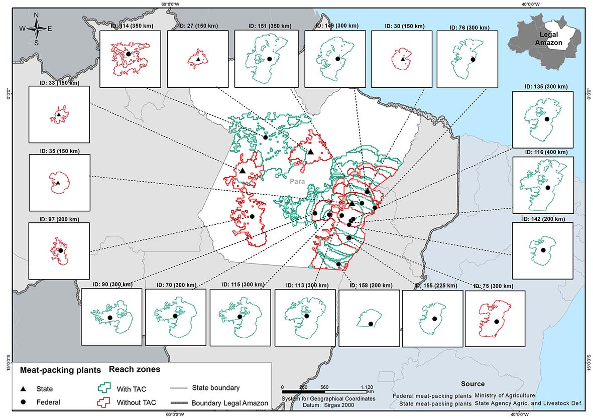 Figure 20. Potential zones for purchasing cattle of the active meat-packing plants registered with the SIE and SIF and with and without TAC in the Brazilian Amazon in 2016