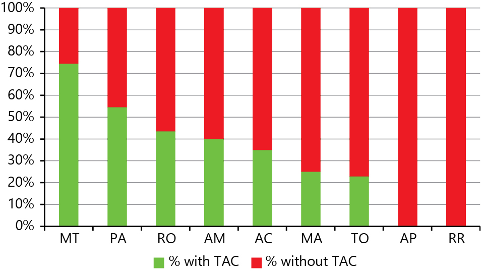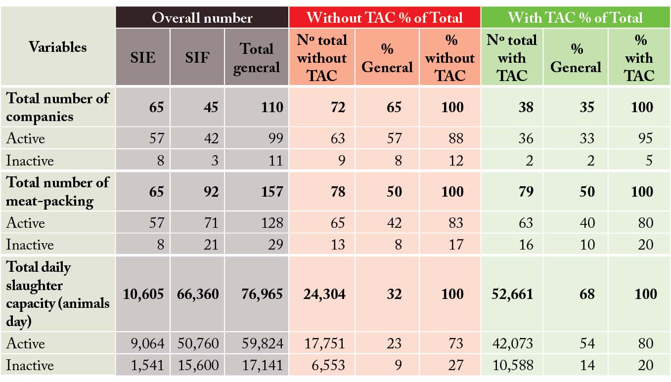 Table 1. Number of companies, of meat-packing plants and their overall slaughter capacity and with and without TAC among the meat-packing plants with state (SIE) and federal (SIF) registration in the Brazilian Amazon in 2016