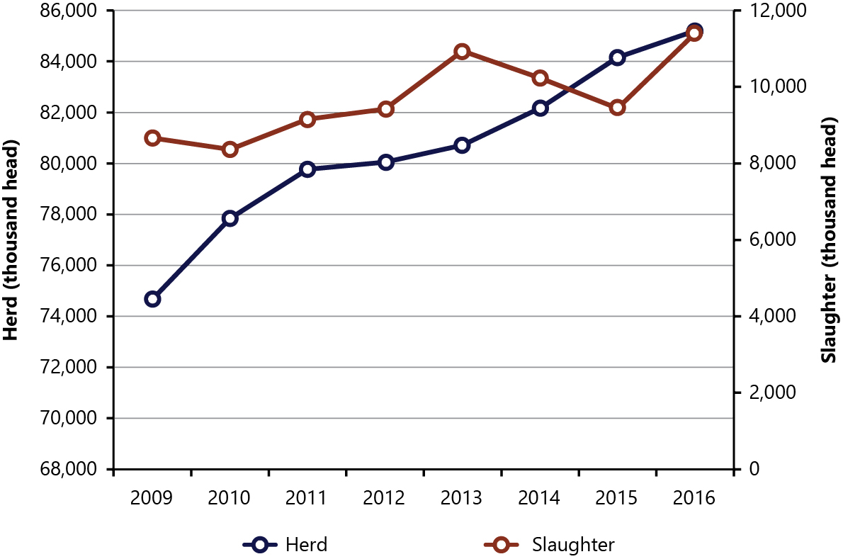 Figure 1. Herd and slaughter of bovine cattle in the Brazilian Amazon from 2009 to 2016